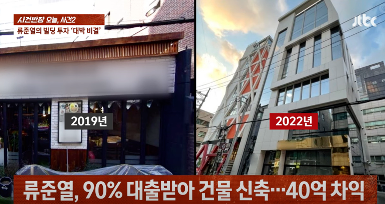 빌딩 매매 컨설팅 관계자는 류준열의 건물에 대해 "새 건물이 연면적 306.54평이다. 건축비를 평당 800만 원으로 잡으면 24억 원 정도다. 공사비의 약 70%를 대출 받은 셈"이라고 전했습니다. 류준열의 건물은 2021년 11월에 완공됐지만 그는 곧바로 건물을 매각했습니다.