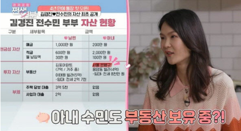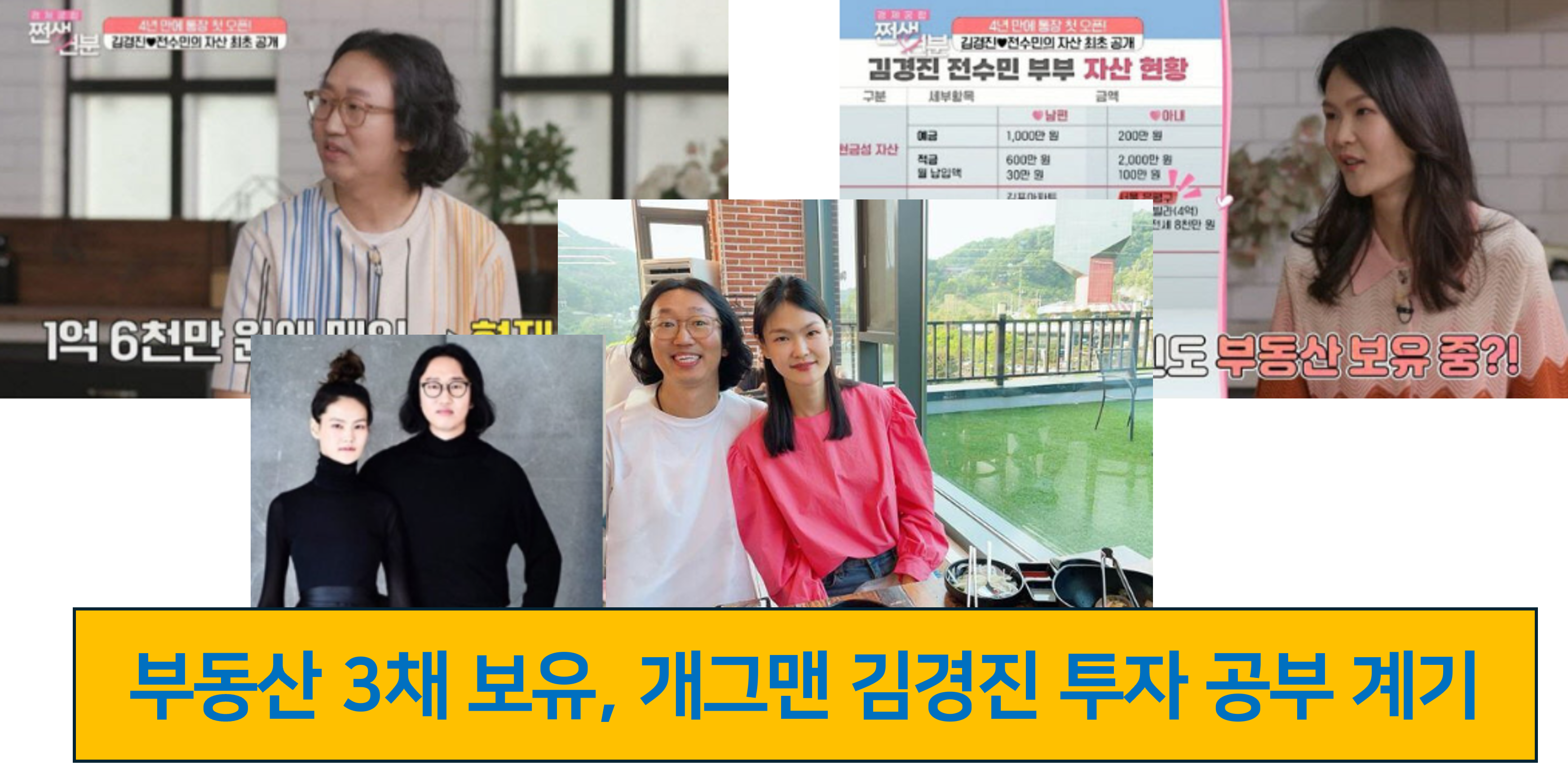 개그맨 김경진이 방송에서 부동산 재테크 노하우를 말하며 부동산 투자 고수임을 밝혔습니다. 방송된 E채널 ‘쩐생연분’에서는 4년차 부부로서 서로의 자산을 공개하는 김경진과 모델 전수민 부부의 모습이 그려졌습니다. 정확한 전문가의 상담을 위해 부부의 자산을 살펴보던 김구라는 “의외로 두 부부에게 부동산 자산이 많다. 현재 이들이 살고 있는 김포 아파트와 이태원 빌라가 있다. 아내 분도 개인 이태원 빌라를 갖고 계신다”라며 놀라움을 표했습니다.