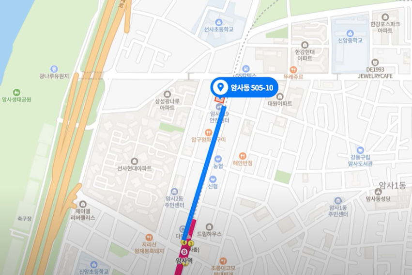박민영이 매입한 건물의 위치는 암사역 8호선 4번 출구에서 400M, 도보로 약 5분 정도 거리로 올림픽로 25M 대로를 접하고 있어 차량 진입이 용이한 위치 입니다. 근처 큰 사거리에서도 건물이 보여 가시성이 좋고, 향후 암사역 넘어 8호선이 연장되는 호재가 있는 곳 입니다.