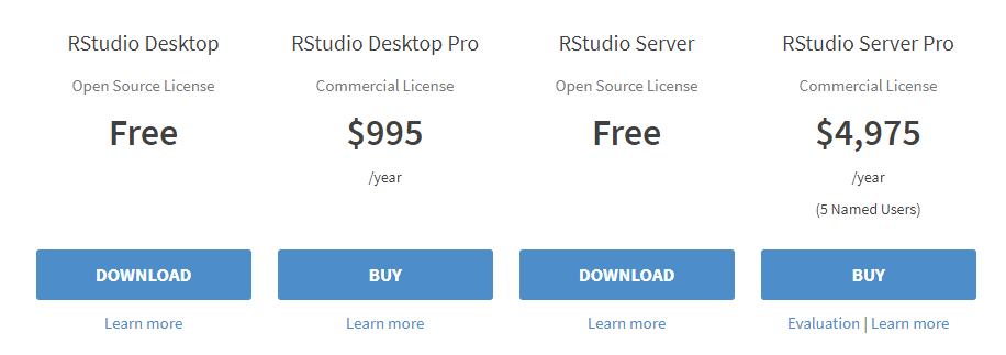 R스튜디오는 크게 Desktop Version과 Server Version으로 구분되고, 이 두가지는 무료버전과 유료버전으로 나뉘어집니다. 학습을 목적으로 R을 사용하기 때문에 특별히 유료버전을 사용하실 필요는 없습니다. 향후 상업적인 목적으로 활용하신다면 Commercial License를 받아 사용하시면 됩니다.