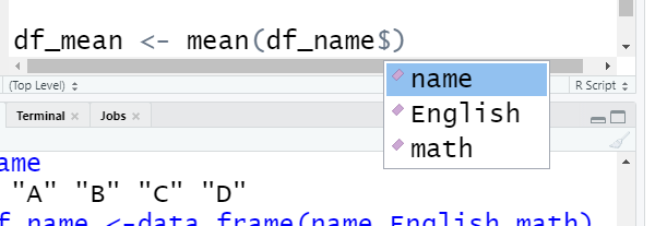 앞서 만든 df_name을 입력하고 $를 작성하면 아래처럼 name, english, math 가 나타납니다.